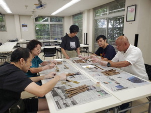 はじめに小枝に1本づつ丁寧に刷毛でニスを塗り、ドライヤーで乾かしました。刷毛で塗るのは2回目なので皆んな上手に出来ました。