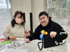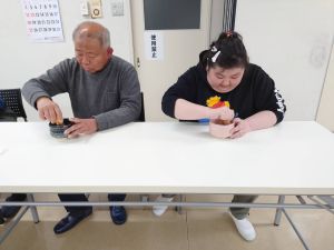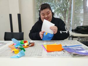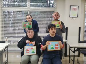 おりがみで、今年の干支の馬と 門松、梅の花を作りました。細かい作業もあり、難しいと感じたところもあったと思いますが、スタッフの助けを借りながら折り進めました。同じ色のおりがみを使っているのですが、完成品は個性的なものになり、素敵な壁掛けができました。