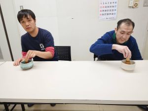 お抹茶とお湯が入るとそれぞれシャカシャカと茶筅を動かし始めました。泡立てるのは根気がいるので声掛けをしたり、お手伝いをしたりしました。満足した様子でおまんじゅうとお茶を楽しんでいました。