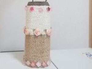 ペットボトルに両面テープ張るとずれずに巻きやすくなります。隙間ができないように丁寧に巻いて花やアクリルストーンなどで飾り付けをし、素敵なフラワーベースが出来ました。